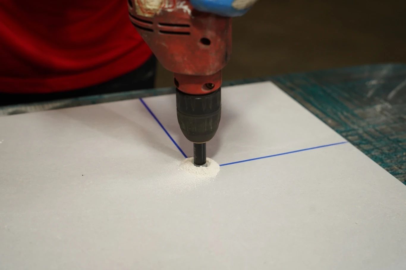正确示范:在直角交汇处钻一个圆孔,释放瓷砖应力,在后期切割的时候就不容易出现开裂。
