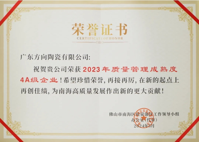 【质量强企】硬汉视频在线观看免费观看陶瓷荣获“2023年质量管理成熟度4A级企业”